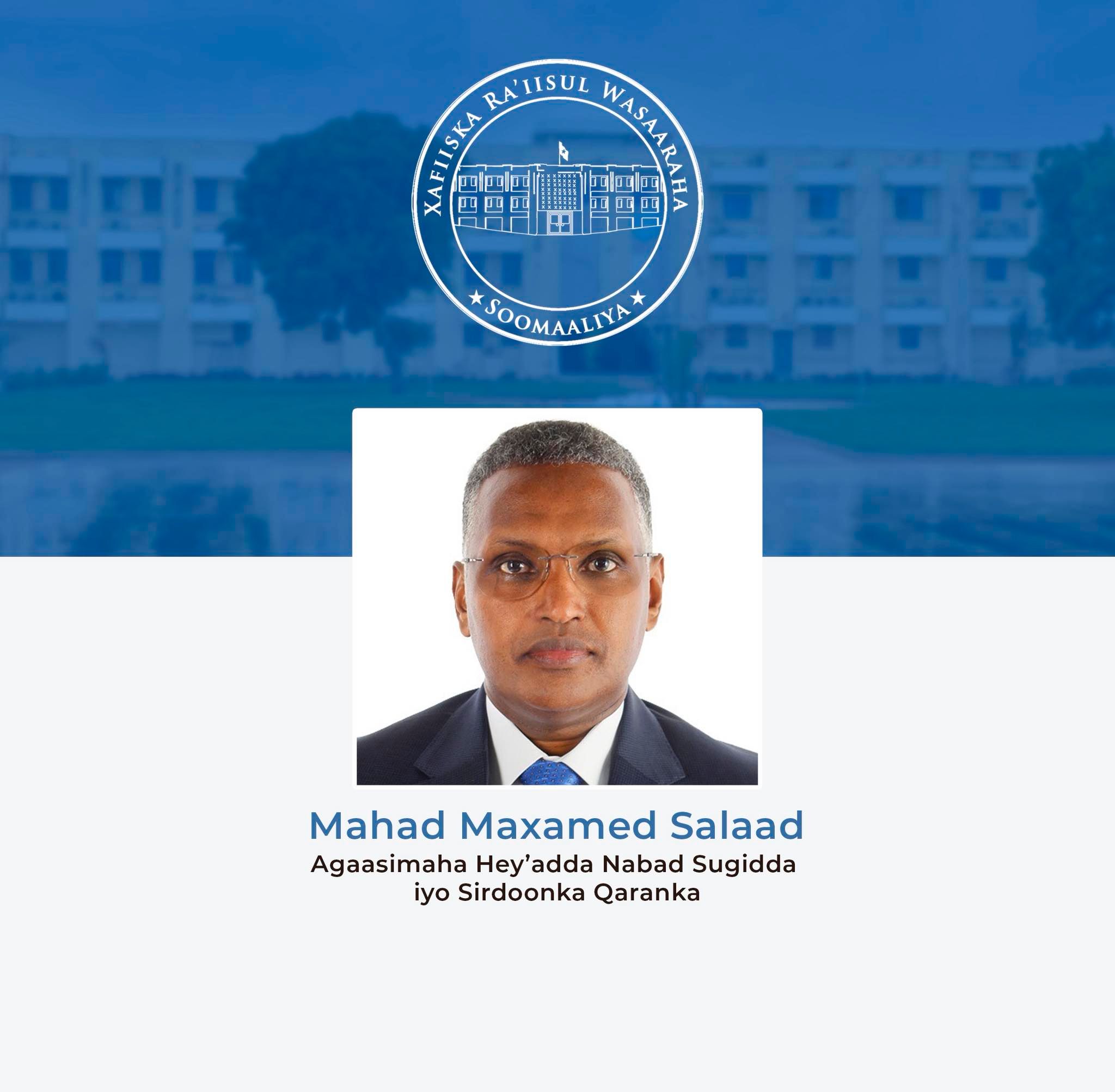 Agaasimaha Hey’adda Nabad Sugidda iyo Sirdoonka Qaranka Mudane Mahad Maxamed Salaad, ayaa aqoon iyo khibrad u leh howlaha Sirdoonka iyo nabad-sugidda Qaranka, isaga oo hore u soo qabtay xilal kala duwan oo ay kamid yihiin, Wasiir, Xildhibaan, iyo Agaasimaha Hey’adda NISA.