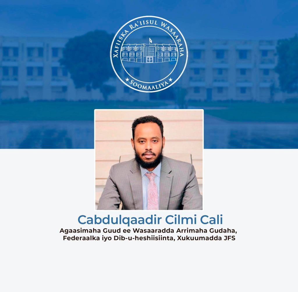 Ra’iisul Wasaaraha Xukuumadda Jamhuuriyadda Federaalka Soomaaliya Mudane Xamsa Cabdi Barre ayaa Agaasimaha Guud ee Wasaaradda Arrimaha Gudaha , Federaalka iyo Dib-u-heshiisiinta u magacaabay Mudane Cabdulqaadir Cilmi Cali.