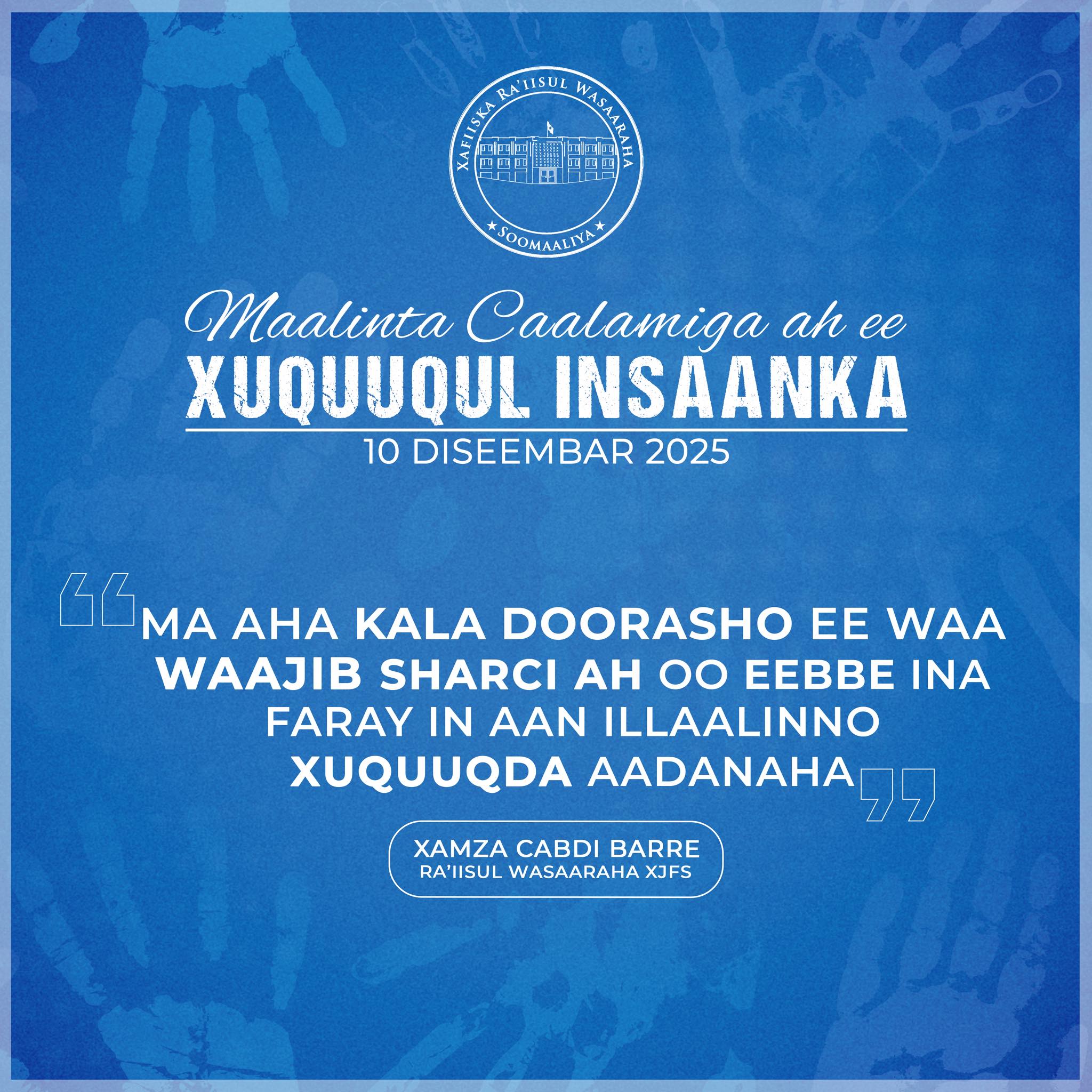 Iyada oo maanta dunida oo dhan laga xusayo maalinta Xuquuqda Aadanaha ayuu Ra’iisul Wasaaraha Xukuumadda JFS Mudane Xamsa Cabdi Barre waxaa uu hambalyo iyo boggaadin u direy guud ahaan bulshada Soomaaliyeed maadaamaa horumar ballaaran laga sameeyay u saldhigista arrimaha xuquuqda aadanaha.