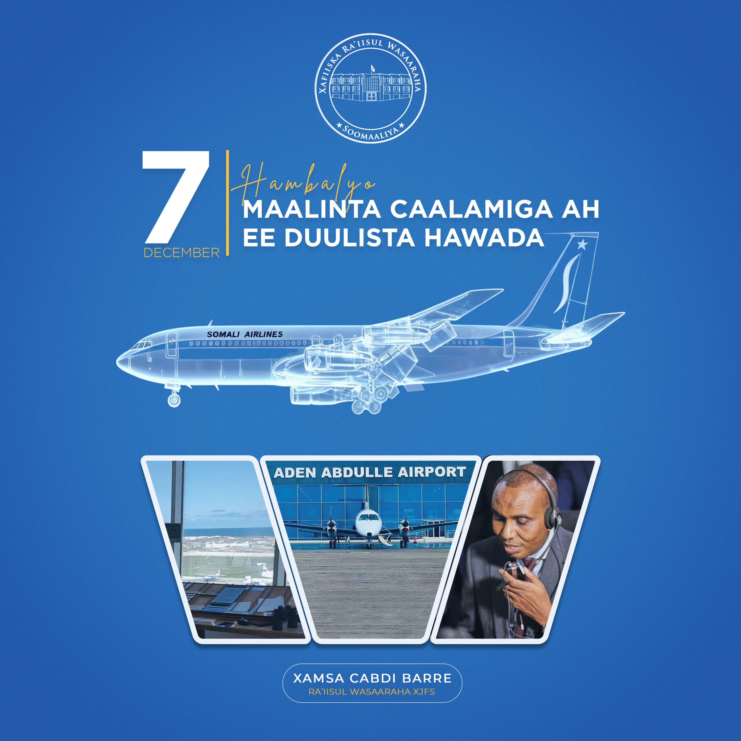 Ra’iisul Wasaare Xamsa ayaa hambalyo iyo bogaadin u diray shaqaalaha Hay’adda Duulista Rayidka Soomaaliyeed, Wasaaradda Gaadiidka iyo Duulista Rayidka, shirkadaha duulimaadyada gudaha iyo caalamka, iyo dhammaan bahda ku hawlan horumarinta duulista dalka.