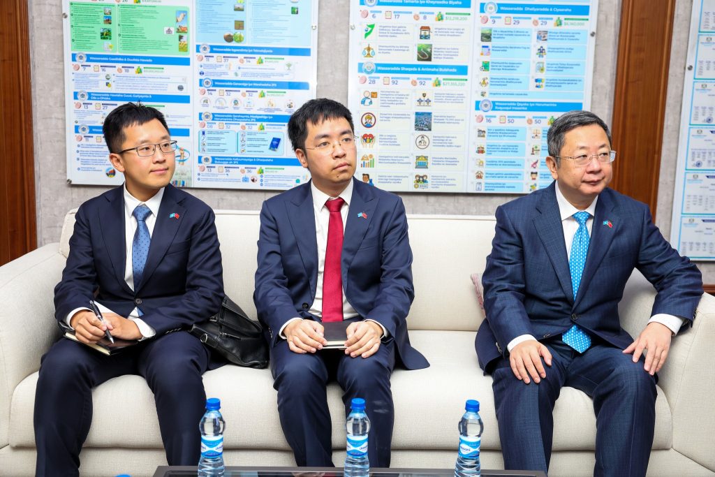 Ra’iisul Wasaaraha Xukuumadda Jamhuuriyadda Federaalka Soomaaliya, Mudane Xamsa Cabdi Barre, ayaa maanta xafiiskiisa ku qaabilay Danjiraha Jamhuuriyadda Dadka Shiinaha u qaabilsan Soomaaliya, Mudane Wang Yu, iyaga oo ka wada- hadlay sidii meel looga soo wada jeesan lahaa faragelinta qaawan ee Isra’iil ku qaaday madax-bannaanida dhuleed ee Jamhuuriyadda Soomaaliya iyo difaaca danaha labada dal ee ku dhisan iskaashiga amniga iyo siyaasadda.