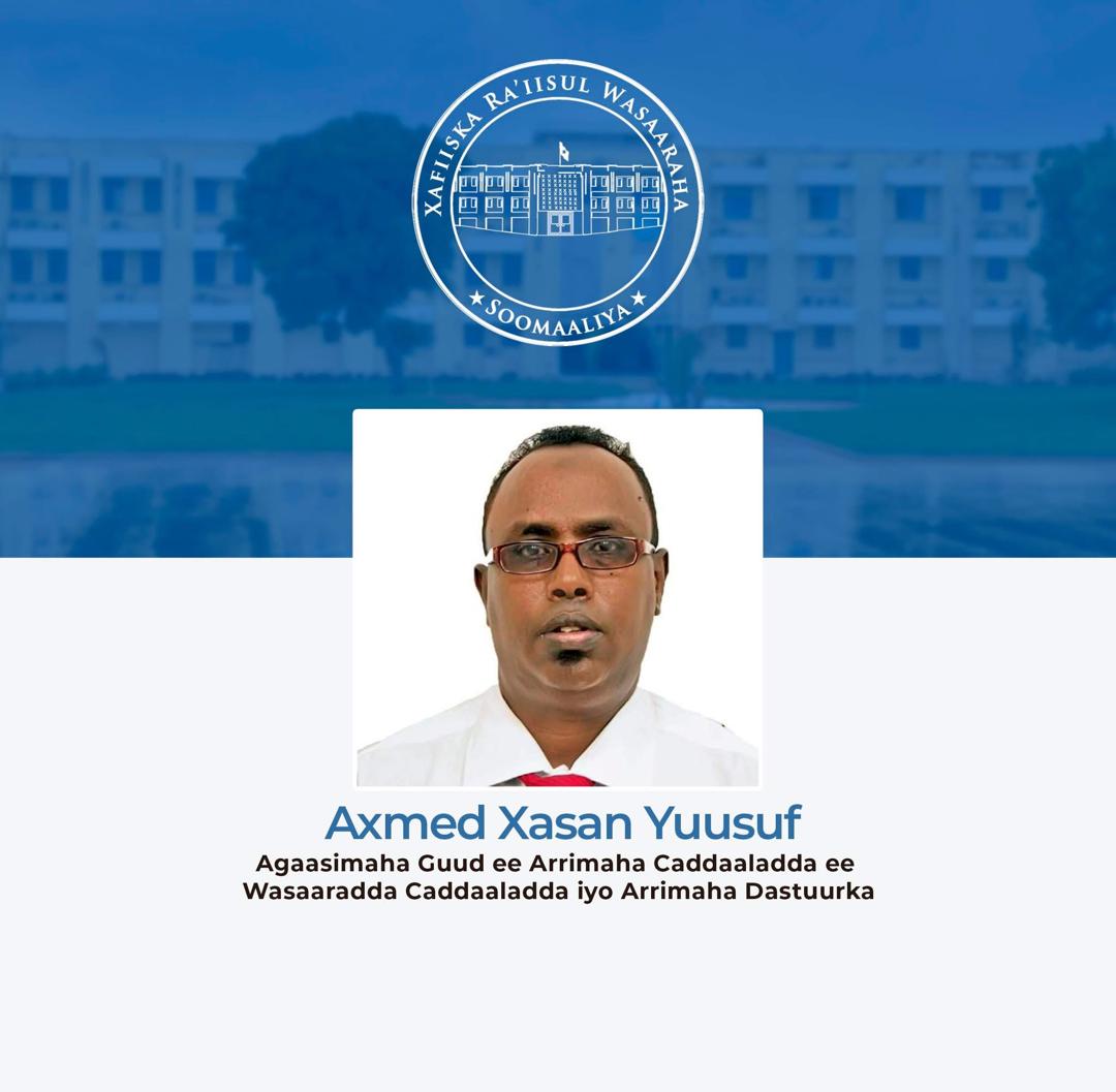 Ra’iisul Wasaaraha Xukuumadda Jamhuuriyadda Federaalka Soomaaliya, Mudane Xamsa Cabdi Barre, ayaa Agaasimaha Guud ee Arrimaha Caddaaladda ee Wasaaradda Caddaaladda iyo Arrimaha Dastuurka u magacaabay Mudane Axmed Xasan Yuusuf.