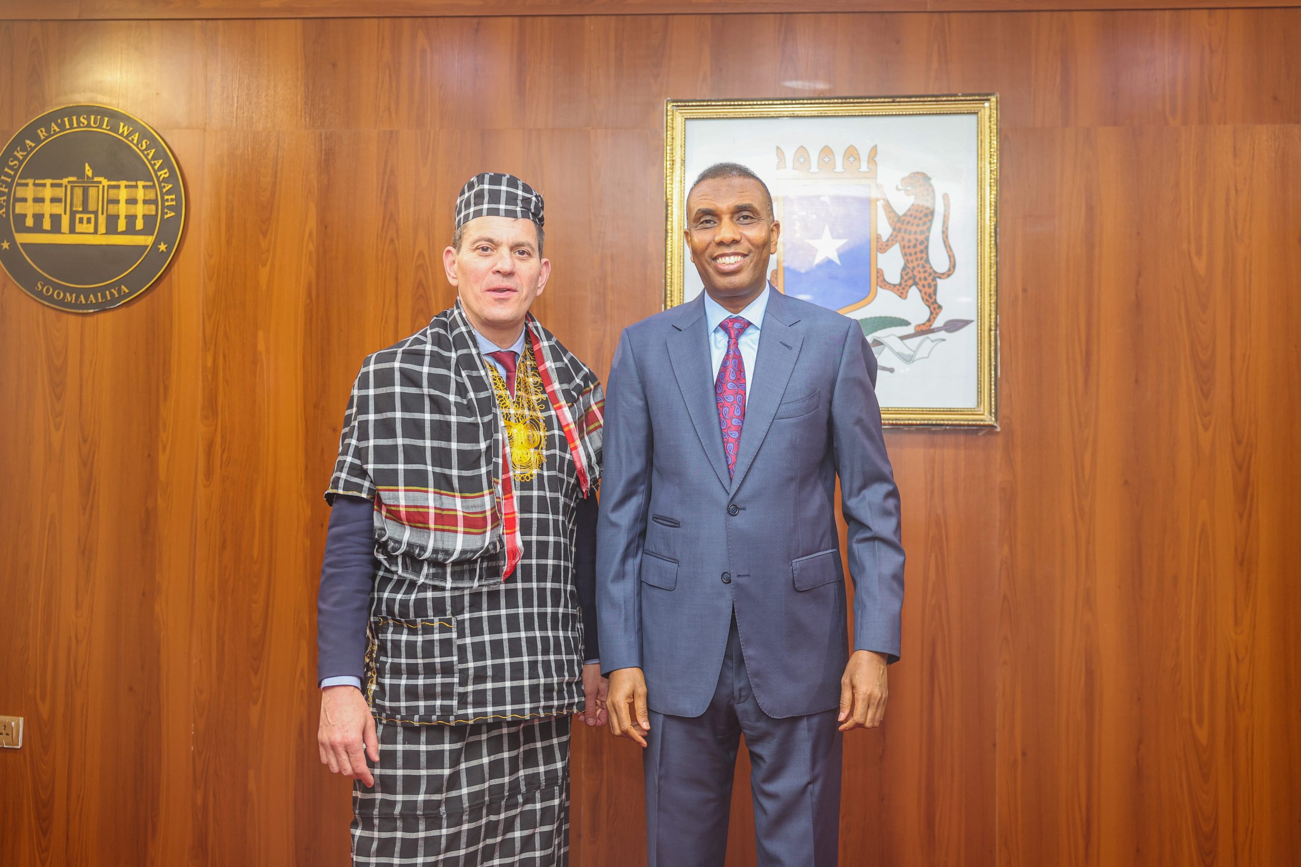 Ra’iisul Wasaaraha Xukuumadda Jamhuuriyadda Federaalka Soomaaliya Mudane Xamsa Cabdi Barre ayaa maanta xafiiskiisa ku qaabilay Madaxweynaha iyo Agaasimaha Guud ee hay’adda Caalamiga ah ee Samafalka (International Rescue Committee – (IRC), David Miliband, oo booqasho shaqo ku yimid dalka.