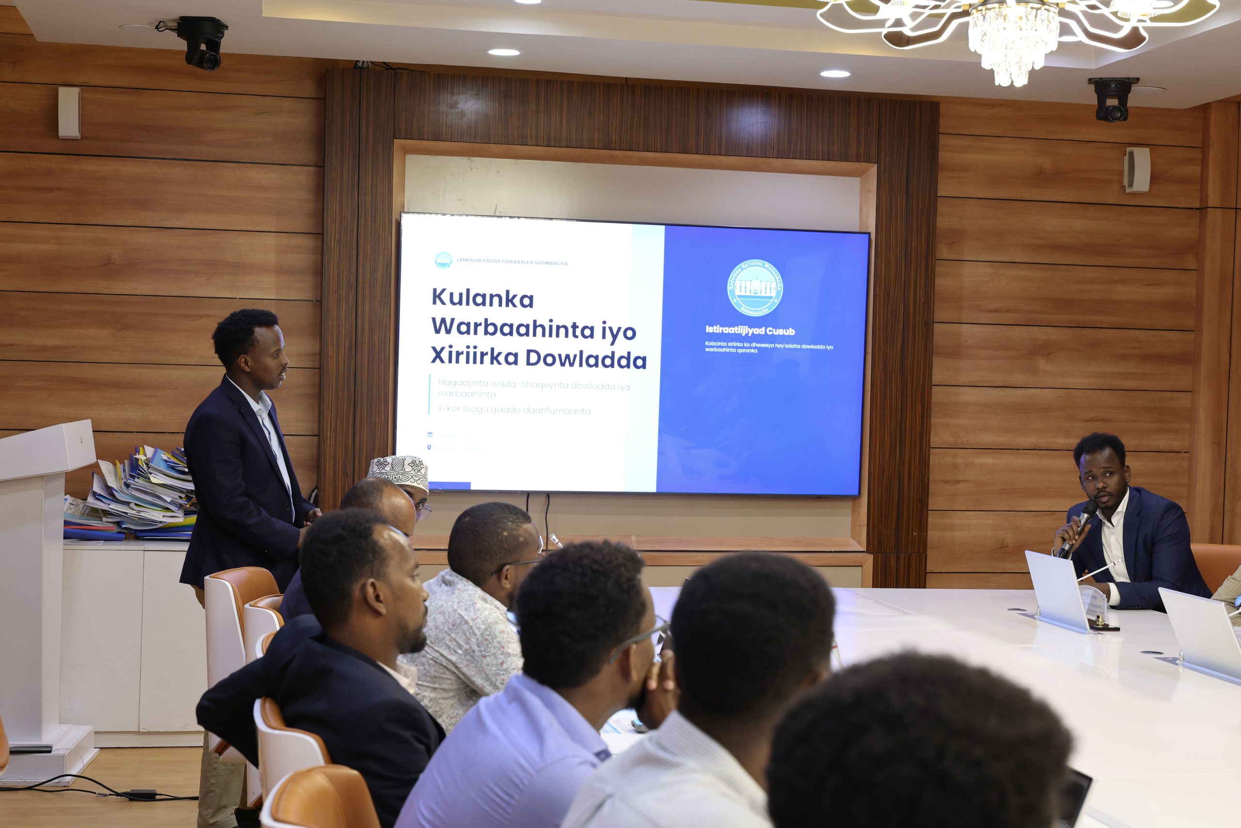 Kulanka oo uu shir-guddoomiyey Afhayeenka Xukuumadda, ahna Agaasimaha Warfaafinta. Xafiiska Ra’iisul Wasaaraha, Mudane Cabdinaasir Axmed Bashiir, ayaa diiradda lagu saaray wada-shaqeynta iyo is-dhaafsiga xogta warbaahineed ee hay’adaha dowladda, si loo helo farriin mideysan oo hufan oo la gaarsiiyo  shacabka Soomaaliyeed, iyada oo la xusay muhiimadda ay leedahay in warbaahinta dowladda ay si wadajir ah uga shaqeeyaan gudbinta xog sax ah, isla markaana ka tarjumeysa hannaanka iyo jihada Xukuumadda.